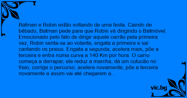 Batman e Robin estão voltando de uma festa. Caindo de bêbado, Batman pede para que Robin vá dirigindo o Batmóvel. Emocionado pelo fato de dirigir aquele carrão pela primeira vez, Robin senta-se ao volante, engata a primeira e sai cantando os pneus. Engata a segunda, acelera mais, põe a terceira e entra numa curva a 140 Km por hоrа. O carro começa a derrapar, ele reduz a marcha, dá um cutucão no freio, corrige o percurso, acelera novamente, põe a terceira novamente e assim vai até chegarem a Batcaverna. Assim que o carro para, Batman vira-se para ele e pede: