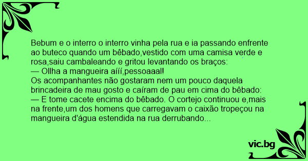 Bebum e o interro o interro vinha pela rua e ia passando enfrente ao buteco quando um bêbado,vestido com uma camisa verde e rosa,saiu cambaleando e gritou levantando os braços:
