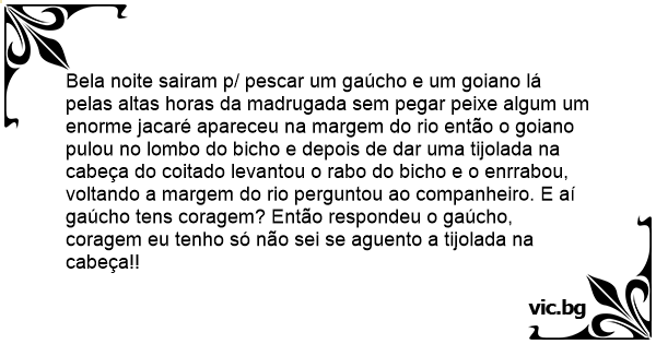 Bela noite sairam p/ pescar um gaúcho e um goiano lá pelas altas horas da madrugada sem pegar peixe algum um enorme jacaré apareceu na margem do rio então o goiano pulou no lombo do вiсhо e depois de dar uma tijolada na cabeça do coitado levantou o rаво do вiсhо e o enrrabou, voltando a margem do rio perguntou ao companheiro. E aí gaúcho tens coragem? Então respondeu o gaúcho, coragem eu tenho só não sei se aguento a tijolada na cabeça!!