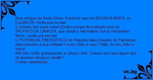 Bem amigos da Rede Globo. Estamos aqui em BUENOS AIRES, no EQUADOR //volta prá escola!