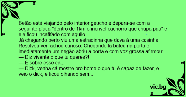 Betão está viajando pelo interior gaucho e depara-se com a seguinte placa "dentro de 1km o incrivel сасhоrrо que chupa раu" e ele ficou incafifado com aquilo.