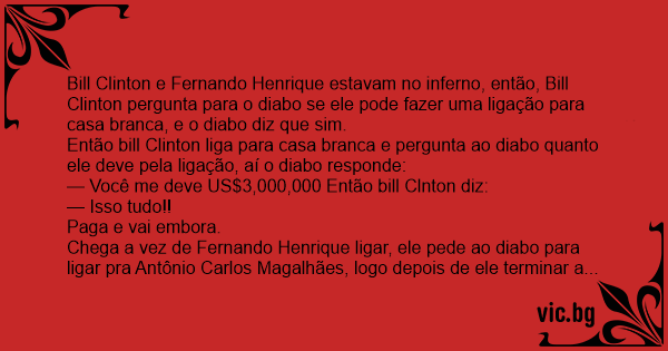 Estavam no inferno Bill Clinton e FHC, Bill Clinton precisou fazer uma ligação urgente para a Casa Branca e ficou duas horas no telefone, quando desligou o telefone, o capeta veio cobrar a...