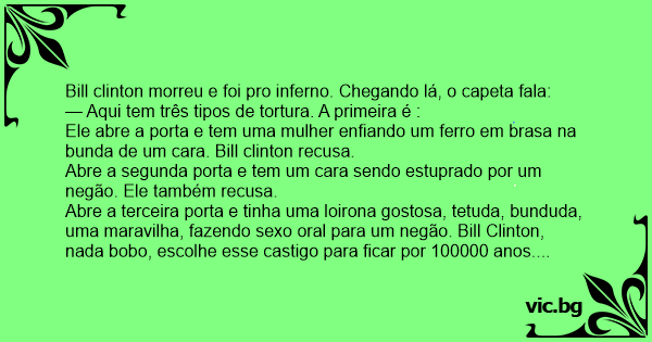 Ele abre a porta e tem uma mulher enfiando um ferro em brasa na bunda de um cara. Bill clinton recusa.