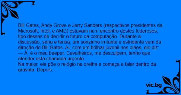 Bill Gates, Andy Grove e Jerry Sanders (respectivos presidentes da Microsoft, Intel, e AMD) estavam num encontro destes foderosos, tipo desses de decidir o futuro da computação. Durante a discussão, séria e tensa, um sonzinho irritante e estridente vem da direção do Bill Gates. Aí, com um brilhar juvenil nos olhos, ele diz: