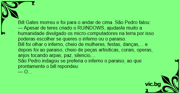 — Apesar de teres criado o RUINDOWS, ajudaste muito a humanidade divulgado os micro-computadores na terra por isso poderas escolher se queres o inferno ou o paraiso.