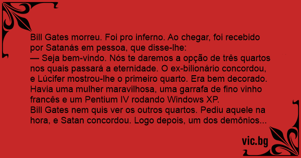Bill Gates nem quis ver os outros quartos. Pediu aquele na hоrа, e Sатаn concordou. Logo depois, um dos demônios subordinados perguntou ao chefe: