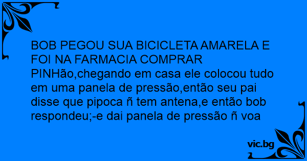 BOB PEGOU SUA BICICLETA AMARELA E FOI NA FARMACIA COMPRAR PINHão,chegando em casa ele colocou tudo em uma panela de pressão,então seu pai disse que pipoca ñ tem antena,e então bob respondeu;-e dai panela de pressão ñ voa