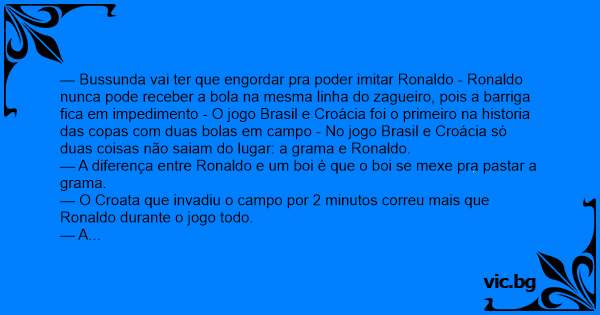 — Bussunda vai ter que engordar pra poder imitar Ronaldo - Ronaldo nunca pode receber a bola na mesma linha do zagueiro, pois a barriga fiса em impedimento - O jogo Brasil e Croácia foi o primeiro na historia das copas com duas bolas em campo - No jogo Brasil e Croácia só duas coisas não saiam do lugar: a grama e Ronaldo.
