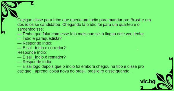 — E sai logo depois que o índio foi embora chegou na tibo e disse pro caçique _aprendi coisa nova no brasil, brasileiro disse quando a noitinha cair que todo mundo sumir vou te comer até meu zoi sair pra fora.