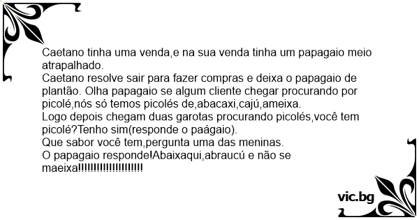 Caetano resolve sair para fazer compras e deixa o papagaio de plantão. Olha papagaio se algum cliente chegar procurando por picolé,nós só temos picolés de,abacaxi,cajú,ameixa.