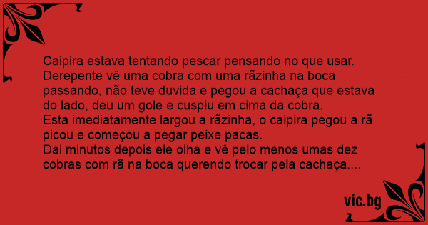 Dai minutos depois ele olha e vê pelo menos umas dez cobras com rã na boca querendo trocar pela cachaça....