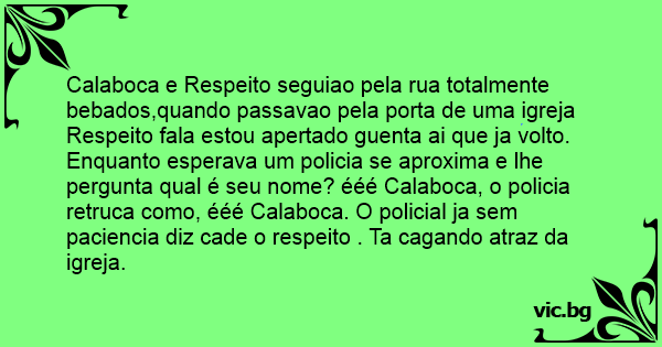Calaboca e Respeito seguiao pela rua totalmente bebados,quando passavao pela porta de uma igreja Respeito fala estou apertado guenta ai que ja volto. Enquanto esperava um policia se aproxima e lhe pergunta qual é seu nome? ééé Calaboca, o policia retruca como, ééé Calaboca. O policial ja sem paciencia diz cade o respeito . Ta cagando atraz da igreja.