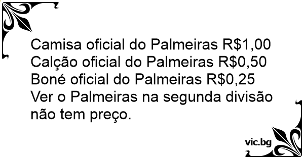 Camisa oficial do Palmeiras R$1,00 Calção oficial do Palmeiras R$0,50 Boné oficial do Palmeiras R$0,25 Ver o Palmeiras na segunda divisão não tem preço.