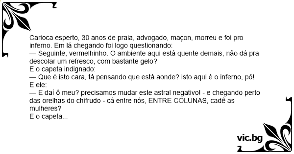 Carioca esperto, 30 anos de praia, advogado, maçon, morreu e foi pro inferno. Em lá chegando foi logo questionando: