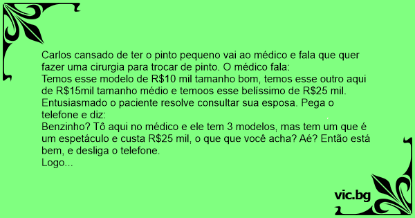 Carlos cansado de ter o pinto pequeno vai ao médico e fala que quer fazer uma cirurgia para trocar de pinto. O médico fala: