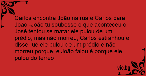 Carlos encontra João na rua e Carlos para João -João tu soubesse o que aconteceu o José tentou se matar ele pulou de um prédio, mas não morreu, Carlos estranhou e disse -ué ele pulou de um prédio e não morreu porque, e João falou é porque ele pulou do terreo