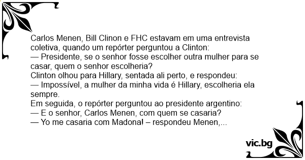 Carlos Menen, Bill Clinon e FHC estavam em uma entrevista coletiva, quando um repórter perguntou a Clinton: