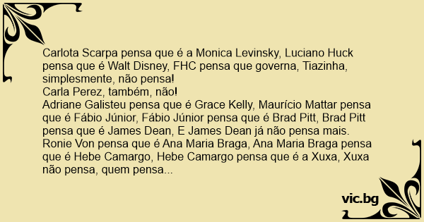 Paulo Coelho pensa que é Mister M, Marta Suplicy pensa que é Hilary Clinton, Nicéa Pitta pensa que é Imelda Marcos, Rosinha Garotinho pensa que é Eva Peron, Daniel pensa que é Agnaldo Rayol, Arnaldo Antunes pensa que é famoso, Gerald Thomas pensa que é bonito, Betty Faria pensa que vai ter 40 anos nas próximas 3 décadas, Ciro Gomes pensa que ninguém ficou sabendo, Patrícia Pillar, também.
