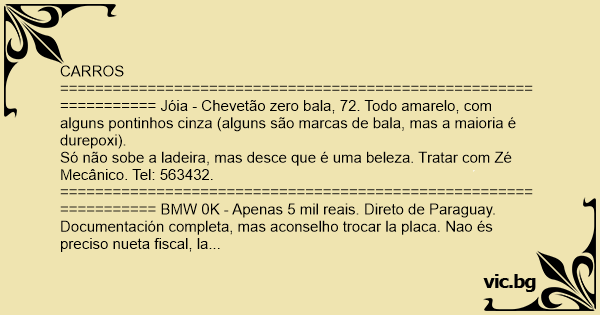 ================================================================= Precisa-se de namorada com automóvel. As interessadas devem mandar fotografias... do automóvel.