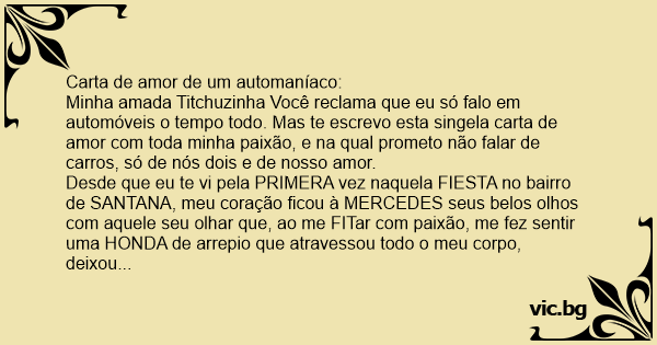 Minha amada Titchuzinha Você reclama que eu só falo em automóveis o tempo todo. Mas te escrevo esta singela carta de amor com toda minha paixão, e na qual prometo não falar de carros, só de nós dois e de nosso amor.