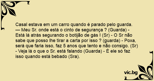 — Meu Sr. onde está o cinto de segurança ? (Guarda) - Está lá atrás segurando o botijão de gás ! (Sr) - O Sr não sabe que posso lhe tirar a carta por isso ? (guarda) - Poxa, será que faria isso, faz 5 anos que tento e não consigo. (Sr) - Veja lá o que o Sr. está falando (Guarda) - É ele só faz isso quando está bebado (Sra).