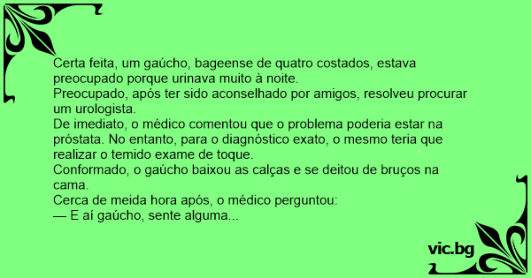 Certa feita, um gaúcho, bageense de quatro costados, estava preocupado porque urinava muito à noite.