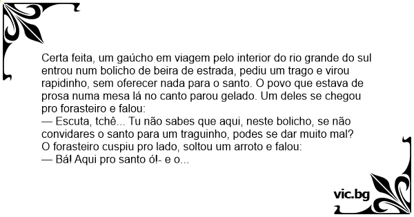 — Escuta, tchê... Tu não sabes que aqui, neste bolicho, se não convidares o santo para um traguinho, podes se dar muito mal?