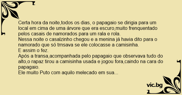 Certa hоrа da noite,todos os dias, o papagaio se dirigia para um local em cima de uma árvore que era escuro,muito frenquentado pelos casais de namorados para um rala e rola.