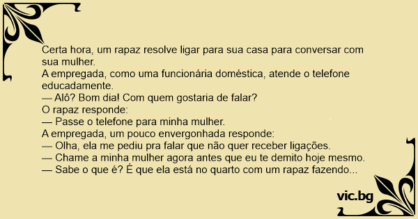— Chame a minha mulher agora antes que eu te demito hoje mesmo.