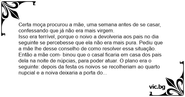 Certa moça procurou a mãe, uma semana antes de se casar, confessando que já não era mais virgem.