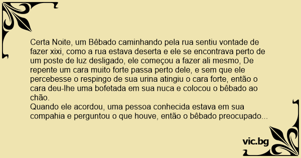 Certa Noite, um Bêbado caminhando pela rua sentiu vontade de fazer xixi, como a rua estava deserta e ele se encontrava perto de um poste de luz desligado, ele começou a fazer ali mesmo, De repente um cara muito forte passa perto dele, e sem que ele percebesse o respingo de sua urina atingiu o cara forte, então o cara deu-lhe uma bofetada em sua nuca e colocou o bêbado ao chão.