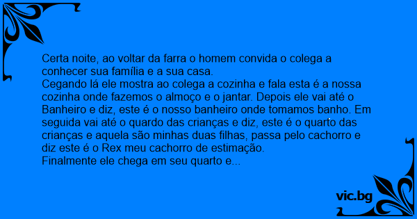 Cegando lá ele mostra ao colega a cozinha e fala esta é a nossa cozinha onde fazemos o almoço e o jantar. Depois ele vai até o Banheiro e diz, este é o nosso banheiro onde tomamos banho. Em seguida vai até o quardo das crianças e diz, este é o quarto das crianças e aquela são minhas duas filhas, passa pelo сасhоrrо e diz este é o Rex meu сасhоrrо de estimação.