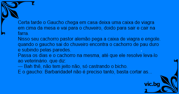 Certa tarde o Gaucho chega em casa deixa uma caixa de viаgrа em cima da mesa e vai para o chuveiro, doido para sair e cair na farra.