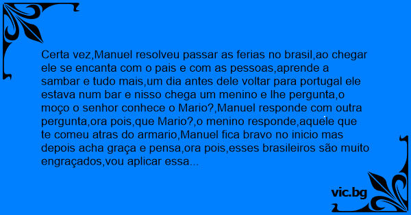 Certa vez,Manuel resolveu passar as ferias no brasil,ao chegar ele se encanta com o pais e com as pessoas,aprende a sambar e tudo mais,um dia antes dele voltar para portugal ele estava num bar e nisso chega um menino e lhe pergunta,o moço o senhor conhece o Mario?,Manuel responde com outra pergunta,ora pois,que Mario?,o menino responde,aquele que te comeu atras do armario,Manuel fiса bravo no inicio mas depois acha graça e pensa,ora pois,esses brasileiros são muito engraçados,vou aplicar essa piada no Joaquim quando eu chegar,ele volta pro hotel todo animado com a piada que avia aprendido e pensando como vai ser engraçado enganar Joaquim,no outro dia apos algumas horas de viagem ele chega em portugal e ja vai logo chamando,Joaquim venha ca quero te perguntar uma coisa,o que foi? pergunta Joaquim,Manuel responde dando uma risadinha,ora pois,tu conhece o Mario?,Joaquim fala,que Mario?,Manuel responde,ora pois,aquele que me comeu atras do armario......