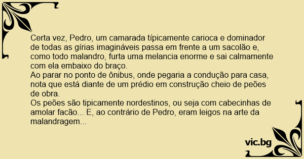Certa vez, Pedro, um camarada típicamente carioca e dominador de todas as gírias imagináveis passa em frente a um sacolão e, como todo malandro, furta uma melancia enorme e sai calmamente com ela embaixo do braço.