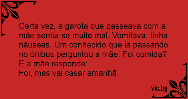 Certa vez, a garota que passeava com a mãe sentia-se muito mal. Vomitava, tinha náuseas. Um conhecido que ia passando no ônibus perguntou a mãe: Foi comida?