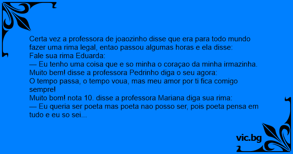 Otima, nota 10! disse a professora Agora e sua vez Joaozinho, diga a sua rima: