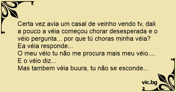 Certa vez avia um casal de veinho vendo tv, dali a pouco a véia começou chorar desesperada e o véio pergunta... por que tú choras minha véia?