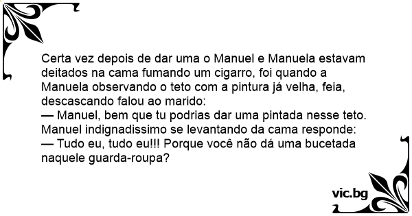 Certa vez depois de dar uma o Manuel e Manuela estavam deitados na cama fumando um cigarro, foi quando a Manuela observando o teto com a pintura já velha, feia, descascando falou ao marido: