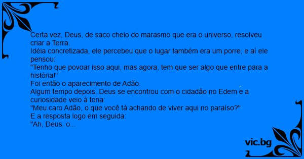 "Meu caro Adão, o que você tá achando de viver aqui no paraíso?"