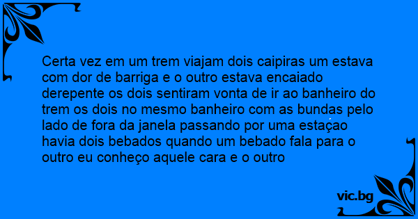 Certa vez em um trem viajam dois caipiras um estava com dor de barriga e o outro estava encaiado derepente os dois sentiram vonta de ir ao banheiro do trem os dois no mesmo banheiro com as bundas pelo lado de fora da janela passando por uma estaçao havia dois bebados quando um bebado fala para o outro eu conheço aquele cara e o outro