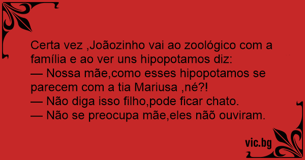 Certa vez ,Joãozinho vai ao zoológico com a família e ao ver uns hipopotamos diz: