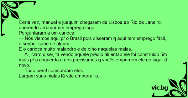Certa vez, manuel e juaquim chegaram de Lisboa ao Rio de Janeiro, querendo arrumar um emprego logo.