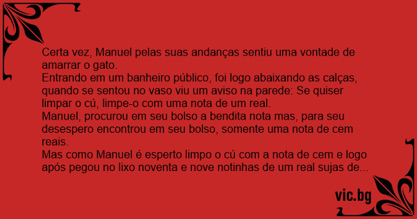 Mas como Manuel é esperto limpo o cú com a nota de cem e logo após pegou no lixo noventa e nove notinhas de um real sujas de bosta.