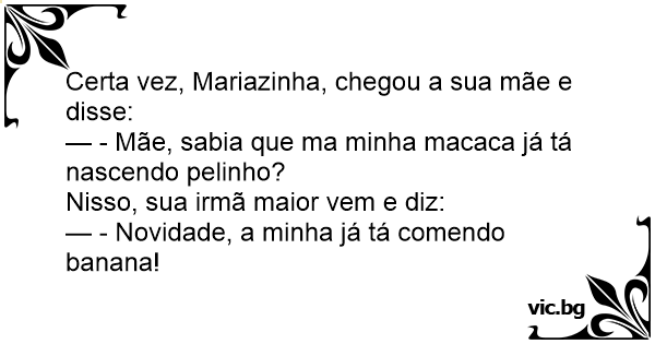 A mãe chega no quarto, encontra a filha pelada e diz: — Filha, a macaquinha está peluda,hein!? A filha faz uma cara e diz : — Xii... Mãe, chego atrasada ,a macaquinha já está até comendo banana.