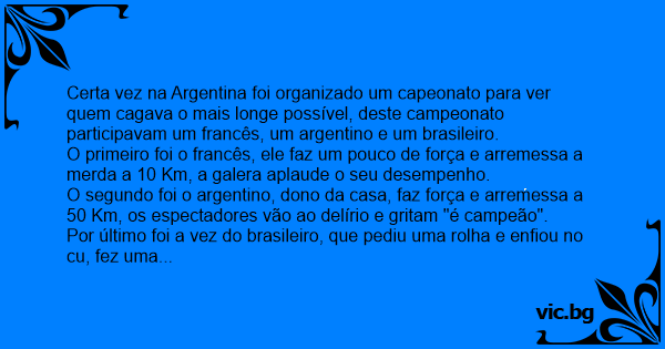 Certa vez na Argentina foi organizado um capeonato para ver quem cagava o mais longe possível, deste campeonato participavam um francês, um argentino e um brasileiro.