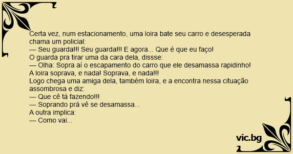 A loira para o caro no supermercado e quando volta, nota um amassado na lateral do carro, nisso passa um cara e diz o seguinde?: — Assopra no escapamento que desamassa!! Então a loira começa a...
