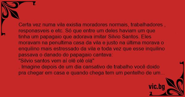 Certa vez numa vila existia moradores normais, trabalhadores , responasveis e etc. Só que entre um deles haviam um que tinha um papagaio que adorava imitar Silvio Santos. Eles moravam na penultima casa da vila e justo na última morava o enquilino mais estressado da vila e toda vez que esse inquilino passava o danado do papagaio cantava:
