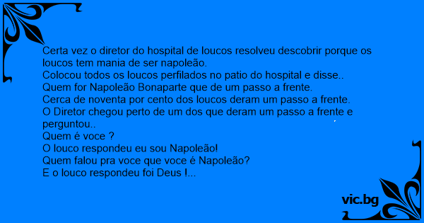 Certa vez o diretor do hospital de loucos resolveu descobrir porque os loucos tem mania de ser napoleão.