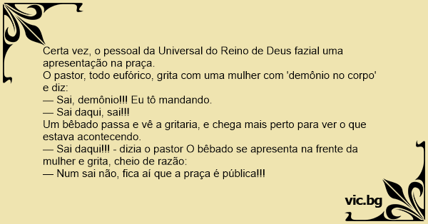 — Sai daqui!!! - dizia o pastor O bêbado se apresenta na frente da mulher e grita, cheio de razão: